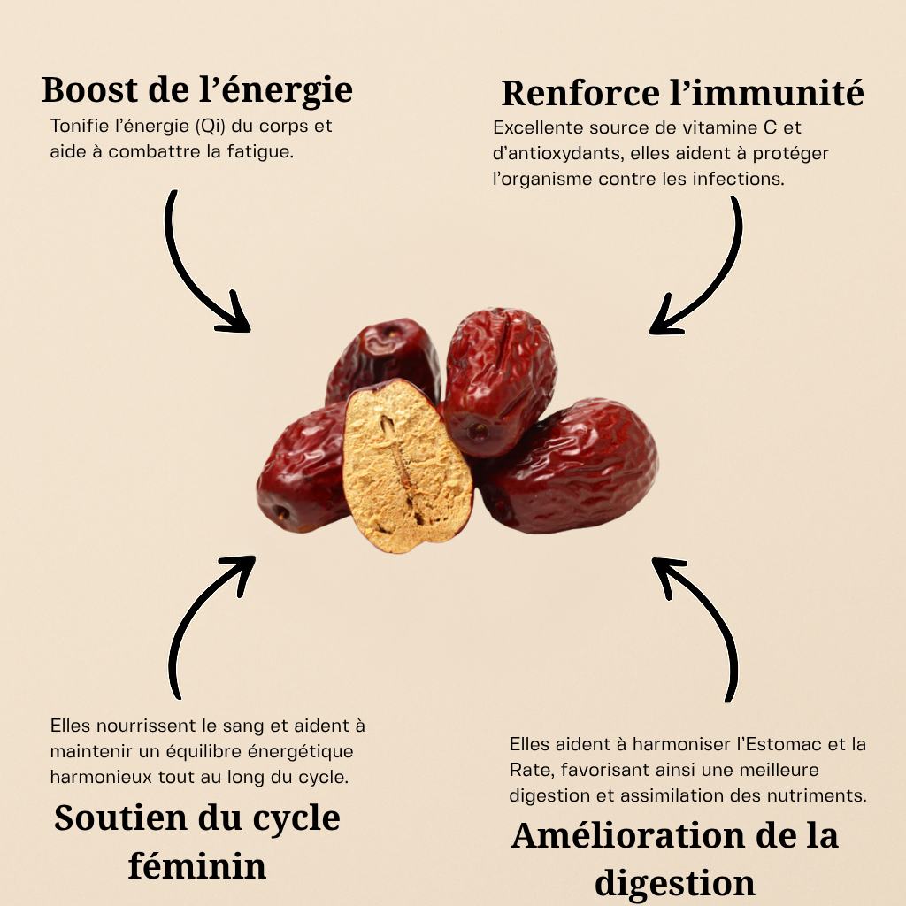 Apprécié pour ses propriétés tonifiantes et équilibrantes, le Jujube Rouge ou Da Zao, tonifie l'énergie vitale (Qi) et nourrit le sang.