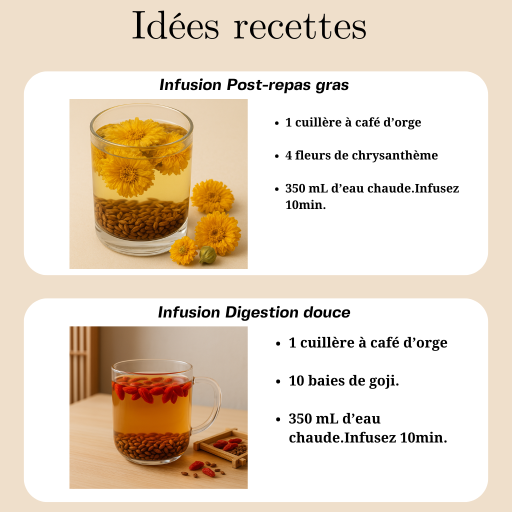 Les graines d'orge sont reconnues pour leurs propriétés nourrissantes et apaisantes. Elles contribuent à renforcer le système digestif et à réguler le métabolisme, tout en favorisant une bonne circulation sanguine.