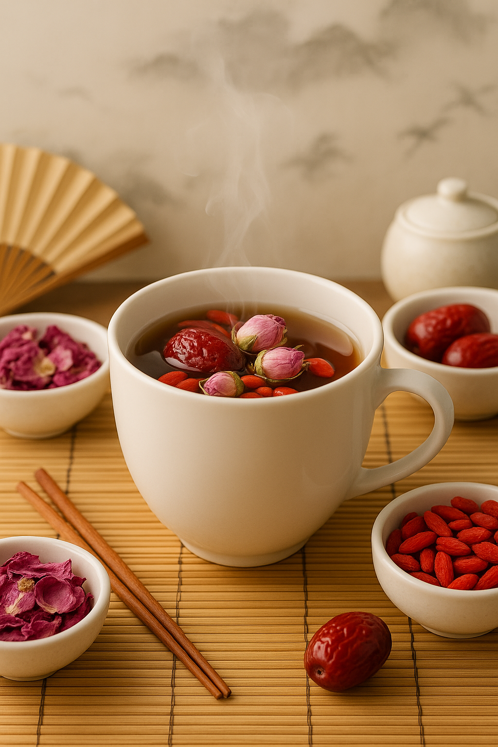 La datte rouge et les baies de goji améliorent la vitalité et luttent contre la fatigue. La baie de goji, en particulier, est riche en vitamines, antioxydants et bêta-carotène, qui favorisent la régénération cellulaire et aident à maintenir un teint éclatant.