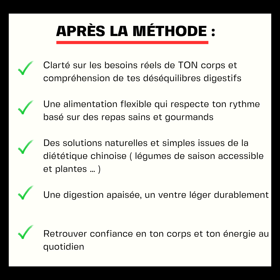 ✅ Retrouver une digestion apaisée, ne plus avoir peur des fins de repas et mieux te sentir vis-à-vis de ton corps.